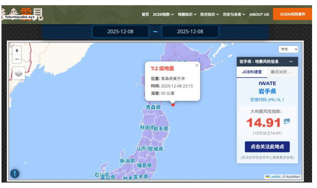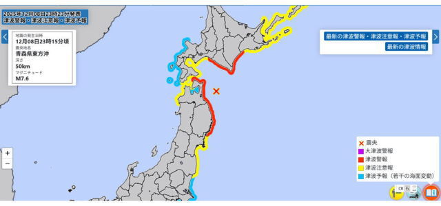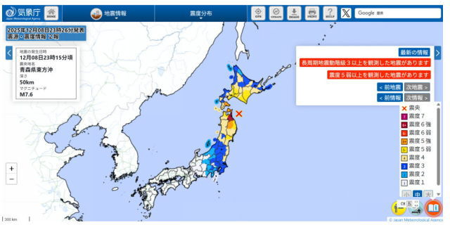 东京时间12月8日23:15,青森县东方冲突发7.6级地震,震源深度50公里,最大震度6。目前气象厅已发布紧急海啸警报,预计可能发生3米左右海啸。