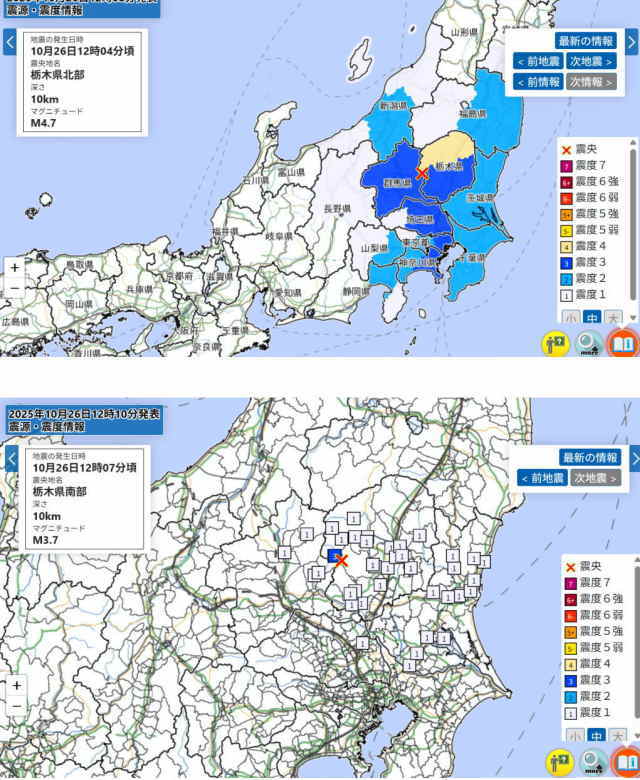仅3分钟后,即12:07左右,栃木县南部(北纬36.6度,东经139.5度)又发生了一次里氏3.7级地震,震源深度同样约10km,最大震度3(足利市等地)。