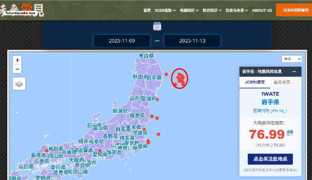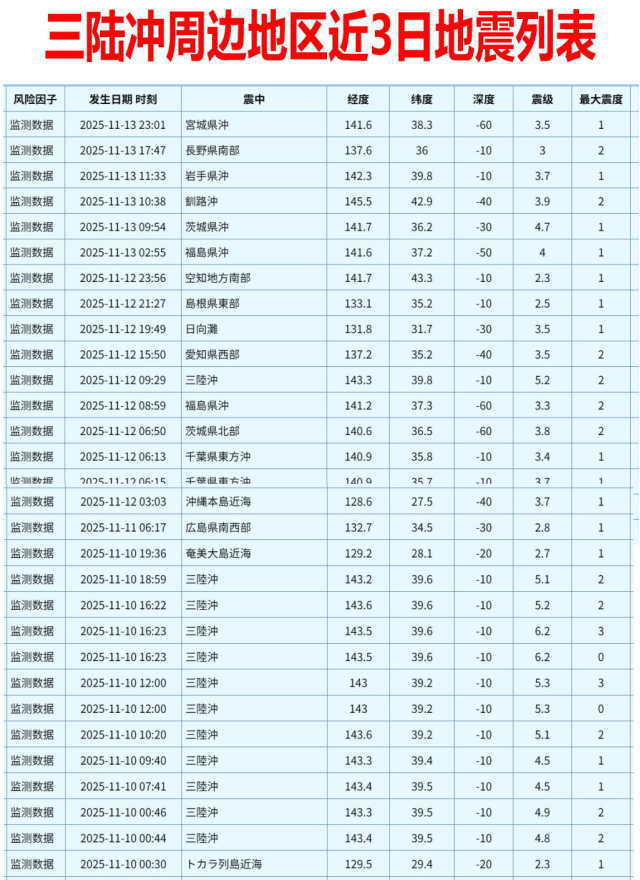 11月9日、10日,日本三陆冲发生了数十次群震,震源深度都是10公里,且位置高度重合。