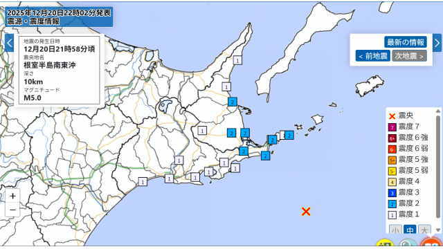 东京时间12月20日晚上9:30和9:33,在3分钟内,北海道根室半岛东南外海接连发生2次5级以上地震。