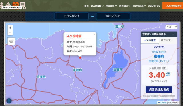 一向被视为“地震少发区”的京都,东京时间今天凌晨4:04却突然发生了一场4.9级地震(部分来源报道为5.1级),震源位于京都府北部(35.4°N, 135.5°E)。