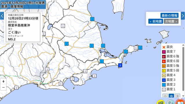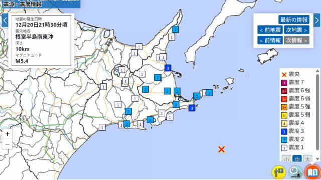 东京时间12月20日晚上9:30和9:33,在3分钟内,北海道根室半岛东南外海接连发生2次5级以上地震。