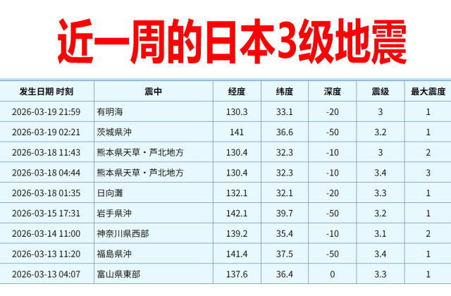 这一周日本4级以上地震共14次(图1),3级以上地震共9次(图2)。